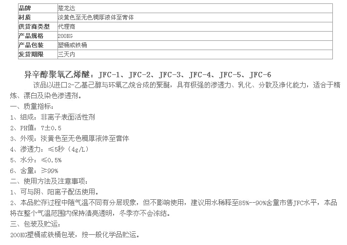 異辛醇聚氧乙烯醚:JFC-1、JFC-2、JFC-3、JFC-4、JFC-5、JFC-6